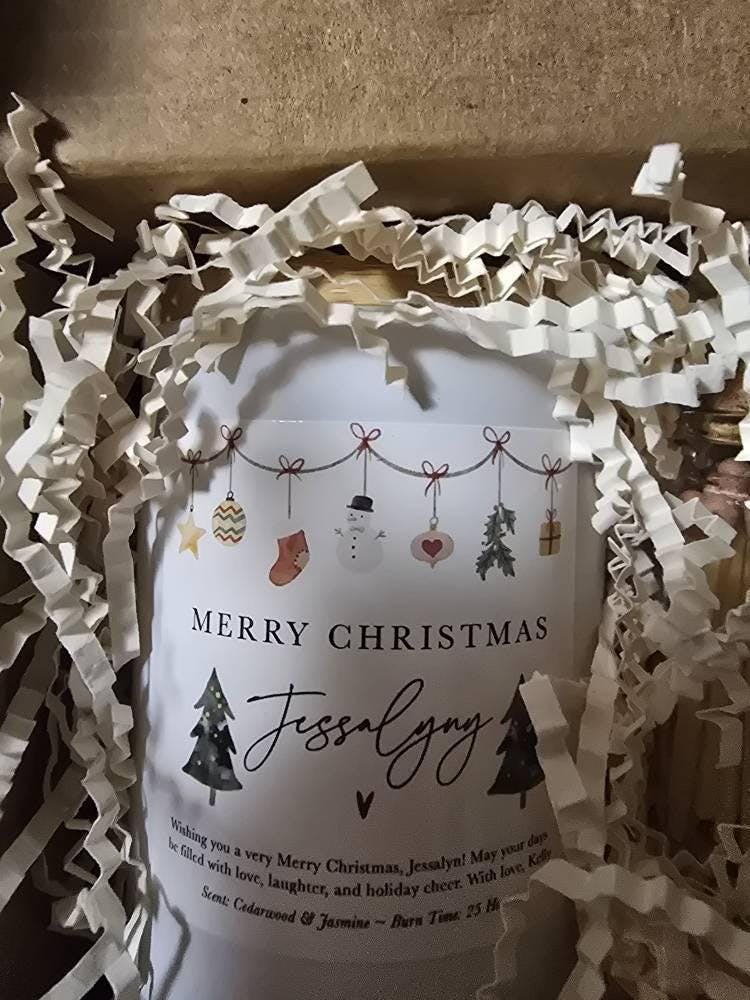 Spread holiday cheer with this Merry Christmas Personalized Candle Gift Box. Customized with a name and message, this festive candle makes a thoughtful Christmas keepsake for friends, family, or loved ones.